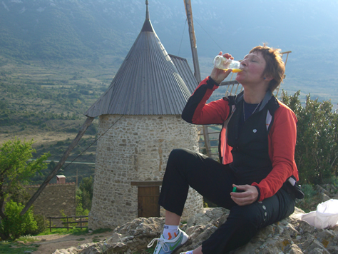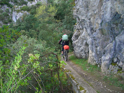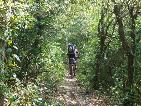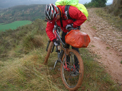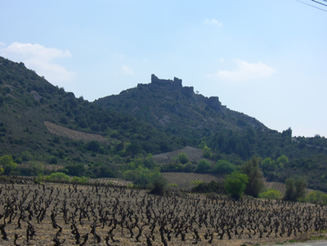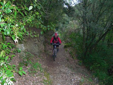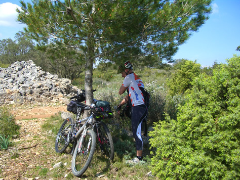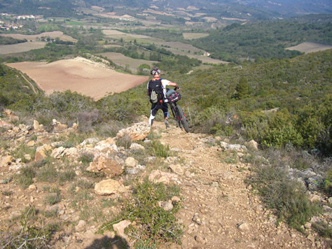 Salimos de Roquefort primero por carretera, luego por pista sembrada de piedras con algunos tramos imposibles, llegamos a la carretera D205 y la cruzamos, al poco tiempo perdemos las marcas del sendero y llegamos a unos molinos, descendemos por un camino, con mucha pendiente y algo complicado, hasta la carretera D50, por la cual continuamos hasta retomar el sendero cátaro. El sendero prosigue por una pista que se va haciendo cada vez mas empinada hasta que se convierte en sendero de pendiente imposible para pedalear y muy dura para empujar la bici, llegamos a la cima exhaustos. Desde Tuchan al final lo hacemos por carretera. Alojamiento en el Auberge de Cucugnan, confortable y muy buena comida.