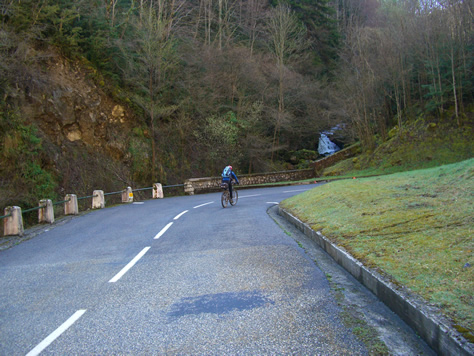 Nos dicen que la pista que pasa por las Gorges de Frau está llena de nieve y que no es posible acceder en bicicleta a Montsegur por ella, decidimos hacerlo por carretera hasta Belesta y de allí a Montsegur, pasamos por una carretera que transcurre por unos bosques de abetos enormes. Nos alojamos en el hotel Costes, correcto.